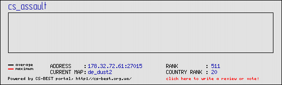 Пользовательское описание отсутствует. Если Вы являетесь владельцем данного сервера, Вы можете получить доступ к статистике и редактированию этого описания. Для этого перейдите по ссылке "Это мой сервер", расположенной в предыдущей таблице. Если ссылки нет - значит Вы все еще не зарегистрировались на нашем портале или забыли зайти под своим логином.
